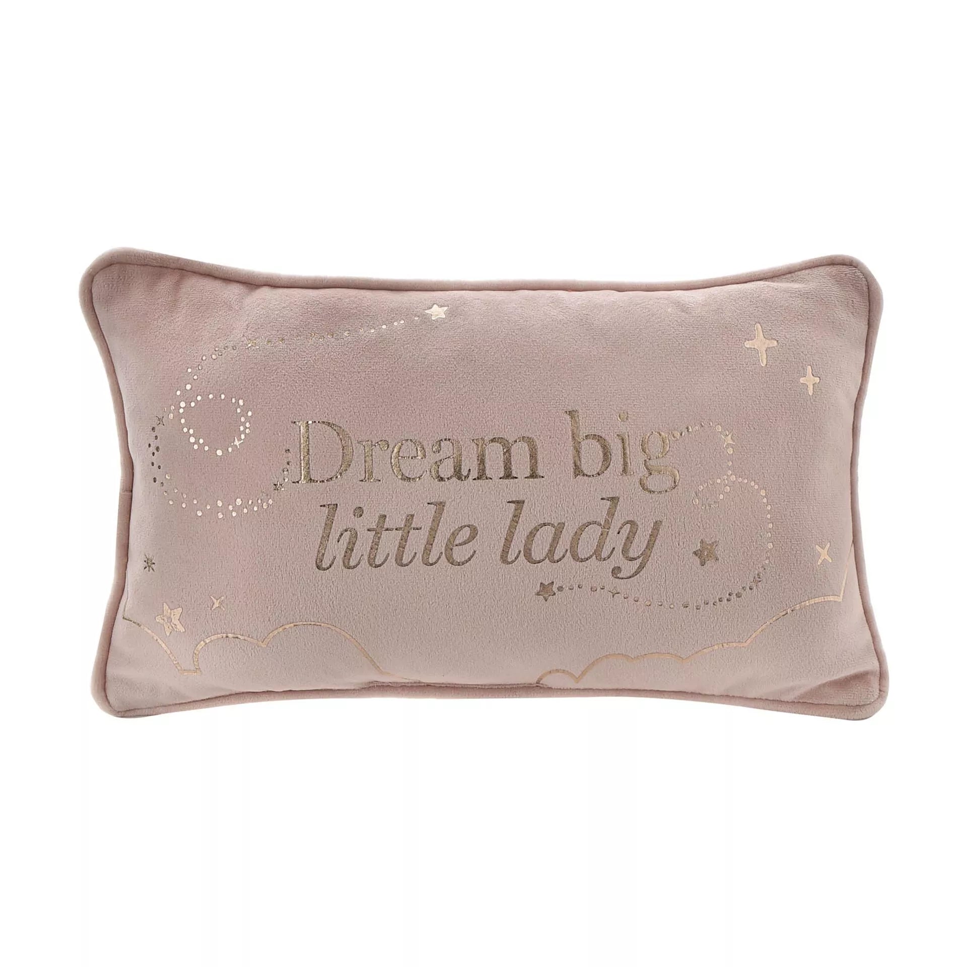 A velvet rectangular cushion from BAMBINO BY JULIANA®. This comforting cushion is a heart-warming addition to any little girl’s or young boy's bedroom or nursery. The blush pink, blue or cream velvet material adds to its luxurious feel and is completed by ‘Dream Big Little Lady’ sentiment in gold lettering. 'Dream big little man' or 'Read me a story, tuck me in tight, tell me you love me & kiss me goodnight.