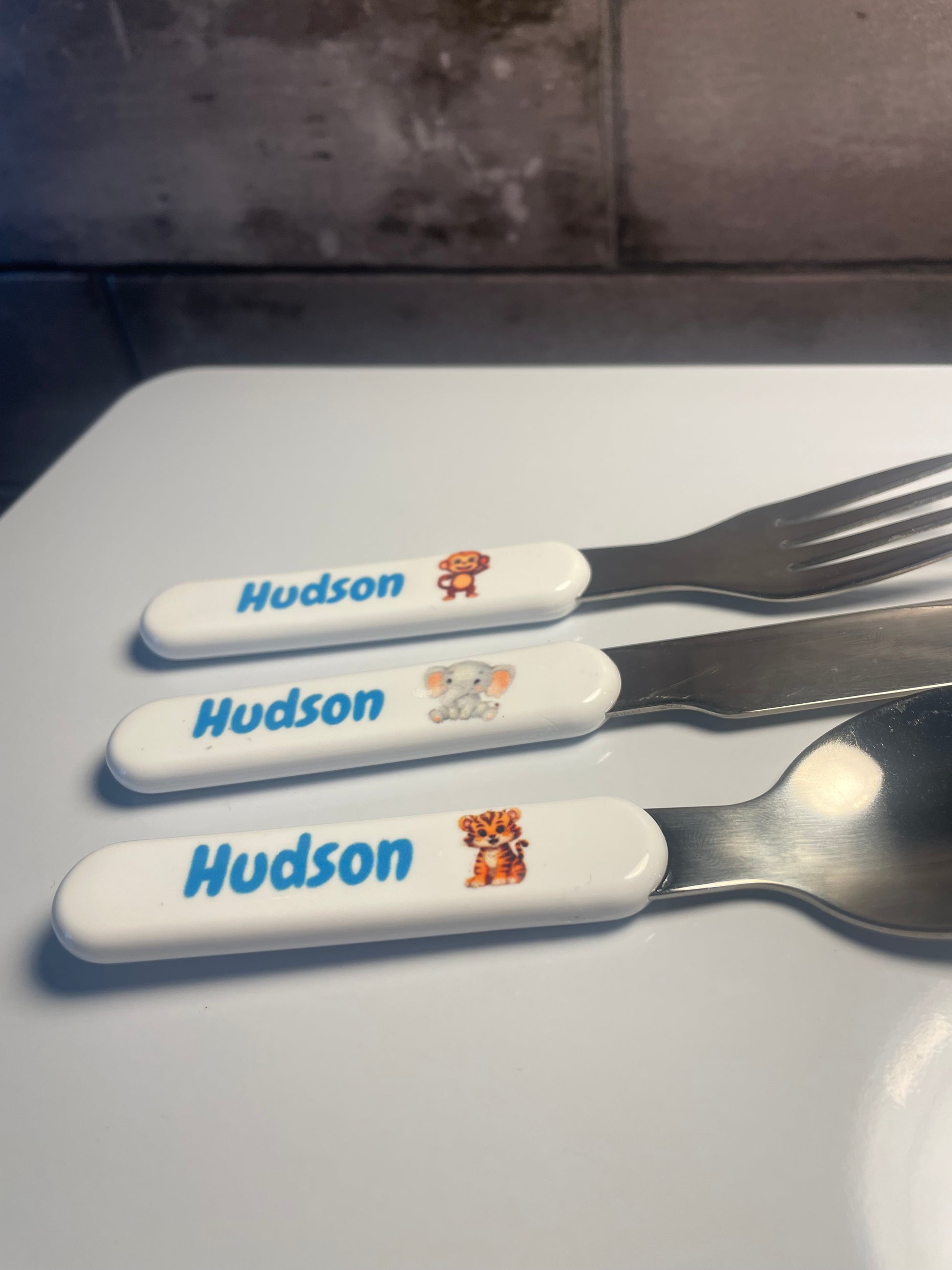 This children's cutlery set is made of durable stainless steel and can be personalized with a name and image of your choice. It comes neatly packaged in a box with a ribbon for a special touch.