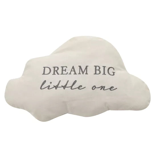 A linen cloud mini cushion from BAMBINO BY JULIANA®. This comforting cushion is a heart-warming addition to any child’s bedroom or nursery. The soft, white linen material adds to its luxurious feel and is completed by an embroidered ‘Dream Big Little One’ sentiment in gunmetal grey lettering. The small size aids relaxation for little ones and is enhanced by its attractive cloud design. The cushion is packaged in a cellophane bag.