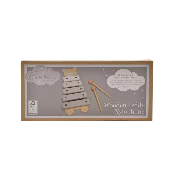 A wooden toy xylophone from BAMBINO BY JULIANA®. This stunning musical instrument blends traditional craftmanship with contemporary design to provide lengthy enjoyment by little ones. The wooden instrument features a natural finish to its neutral colours. The child friendly, teddy bear or elephant design is accompanied by two wooden mallets with round tips which will produce an enjoyable sound to delicate ears. The xylophone is packaged in a branded closed box.